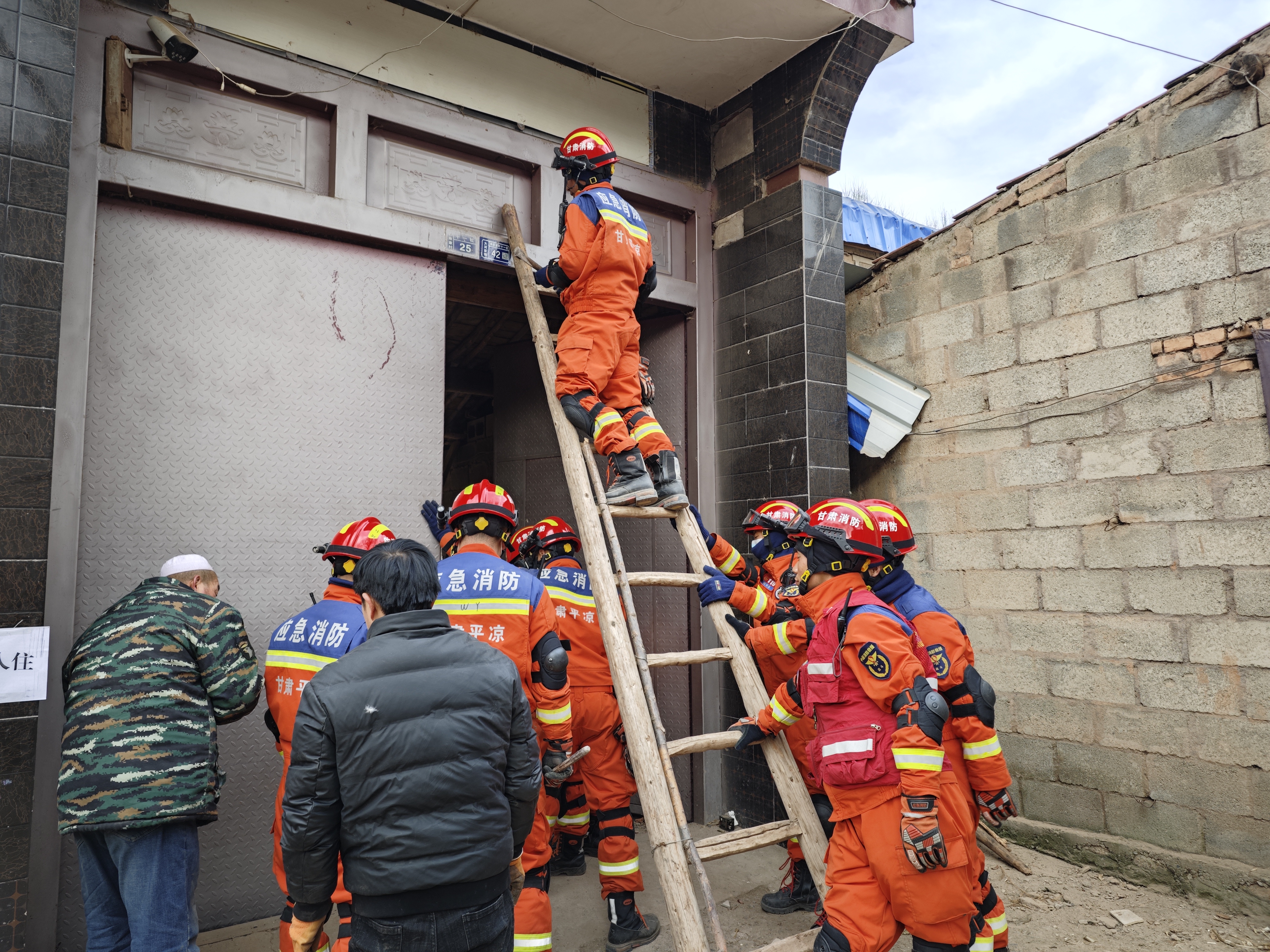 12月21日,甘肃省临夏州积石山县大河家镇韩陕家村,消防救援人员与震区群众合力消除住房安全隐患。科技日报记者 颉满斌 摄