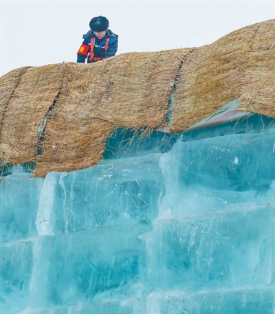在哈尔滨冰雪大世界存冰场,工作人员拆除冰垛外层保温材料。 |
