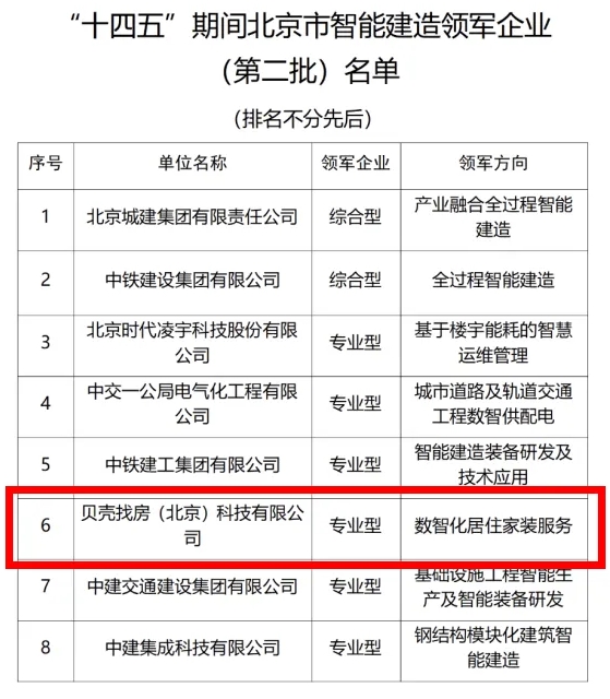 8月27日,北京市住房和城乡建设委员会公布了“十四五”期间北京市智能建造领军企业(第二批)名单,贝壳找房(北京)科技有限公司等8家企业入选,贝壳整装是唯一入选该名单的家装企业。