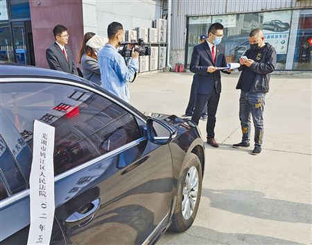 图③:鸠江区人民法院执行干警通过查封车辆,督促被执行人现场履行还款义务。