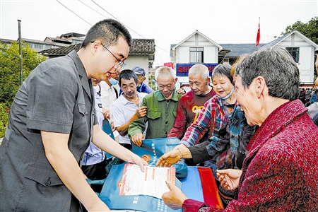 干警们结合“养生排毒骗局”“中奖骗局”“祛病消灾骗局”等典型案例,向老年人耐心讲授防范诈骗知识和技巧,提醒广大群众切实提高防范意识,树立正确养生理念,做到“不听、不信、不转账”,避免上当受骗。图为干警在村民广场发放宣传资料。(记者 刘 洋 通讯员 李 娟 摄)