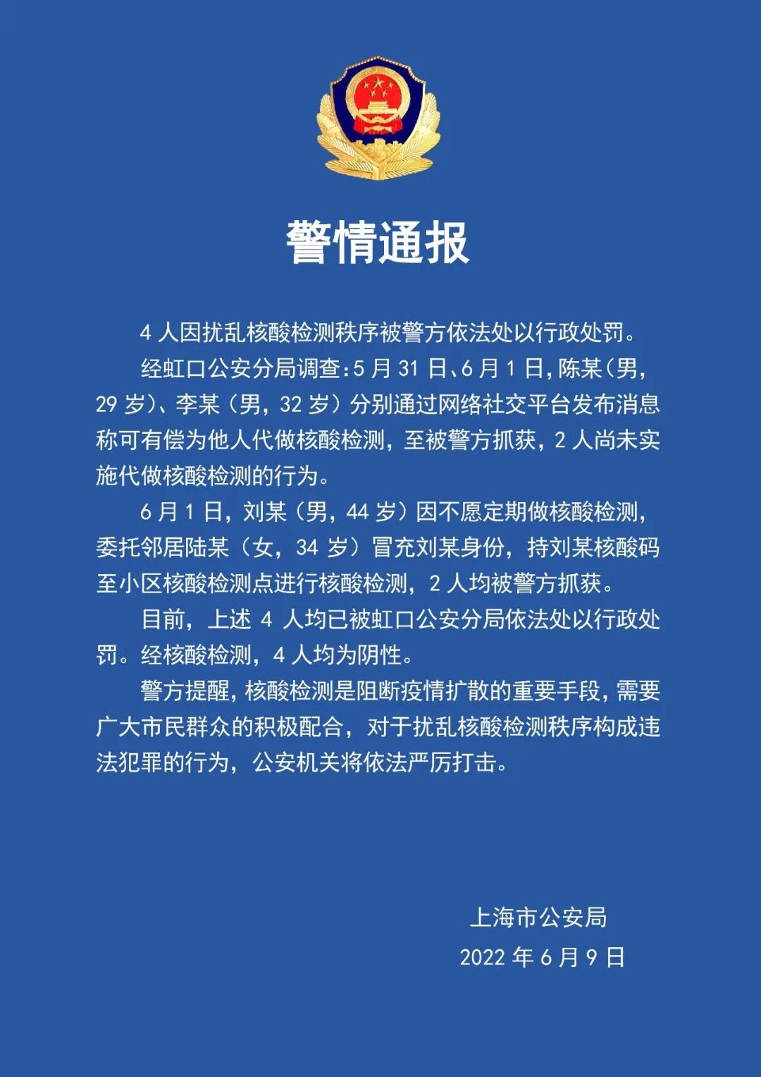目前,上述4人均已被上海虹口公安分局依法处以行政处罚。经核酸检测,4人均为阴性。
