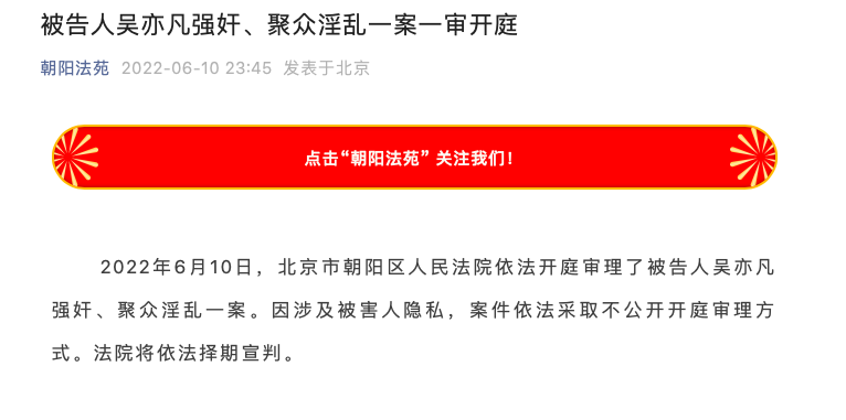 人民网北京6月11日电 (薄晨棣、李楠楠)6月10日,北京市朝阳区人民法院依法开庭审理了被告人吴亦凡强奸、聚众淫乱一案。因涉及被害人隐私,案件依法采取不公开开庭审理方式。法院将依法择期宣判。