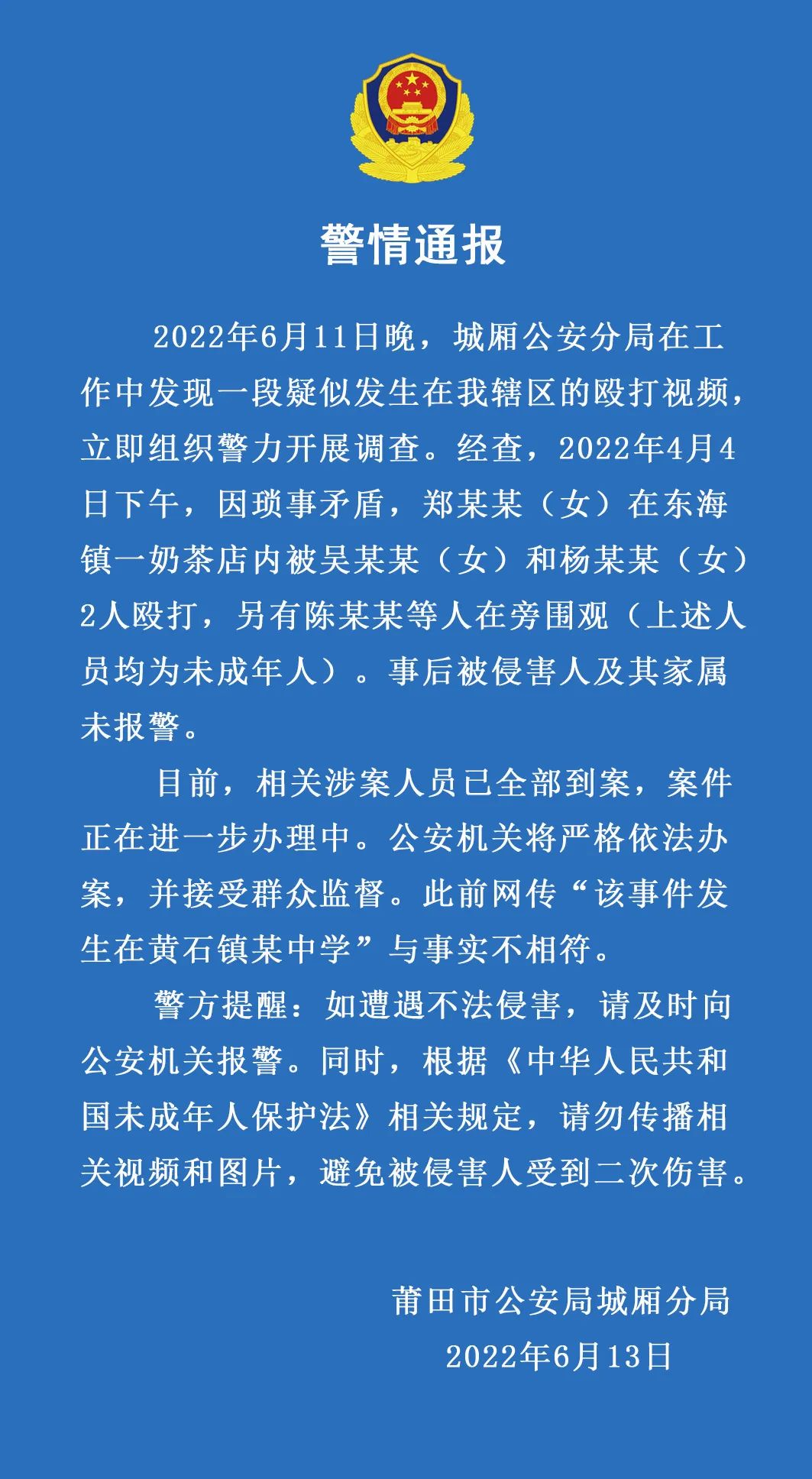 人民网北京6月14日电 (郝萍、吴楠)据莆田市公安局城厢分局6月13日通报,2022年6月11日晚,城厢公安分局在工作中发现一段疑似发生在该辖区的殴打视频,立即组织警力开展调查。经查,2022年4月4日下午,因琐事矛盾,郑某某(女)在东海镇一奶茶店内被吴某某(女)和杨某某(女)2人殴打,另有陈某某等人在旁围观(上述人员均为未成年人)。事后被侵害人及其家属未报警。
