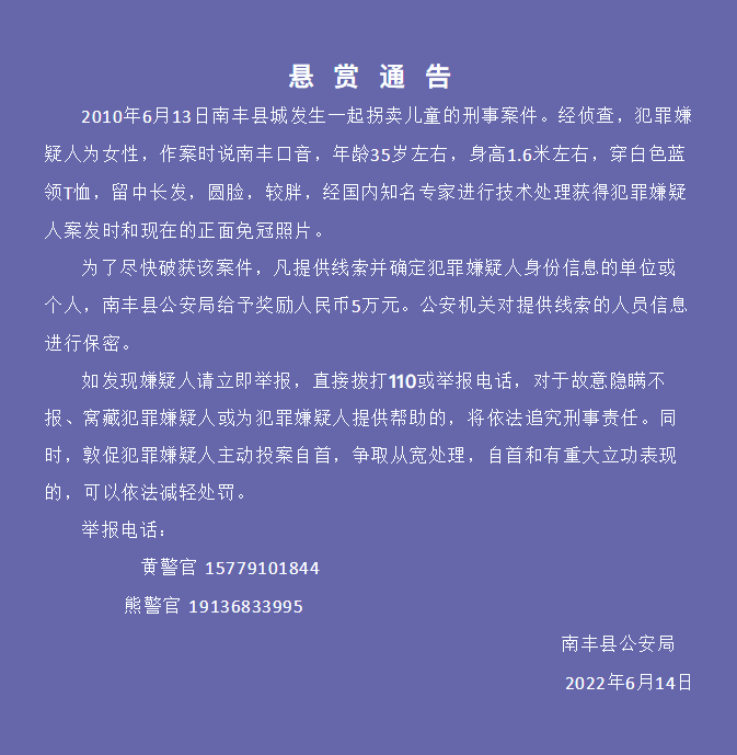 人民网北京6月15日电 (郝萍、吴楠)江西省南丰县公安局6月14日发布悬赏通告,2010年6月13日南丰县城发生一起拐卖儿童的刑事案件。经侦查,犯罪嫌疑人为女性,作案时说南丰口音,年龄35岁左右,身高1.6米左右,穿白色蓝领T恤,留中长发,圆脸,较胖,经国内知名专家进行技术处理获得犯罪嫌疑人案发时和现在的正面免冠照片。