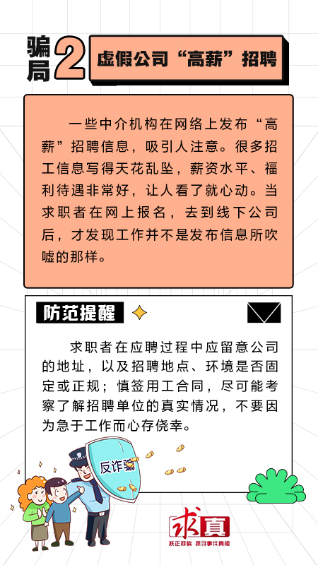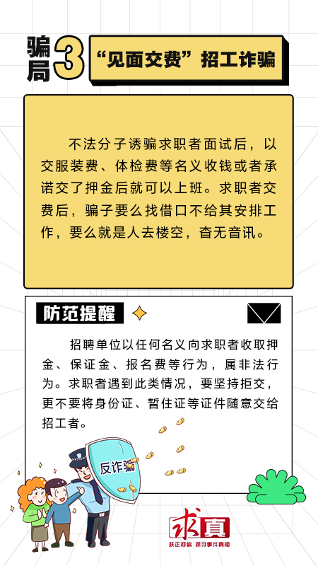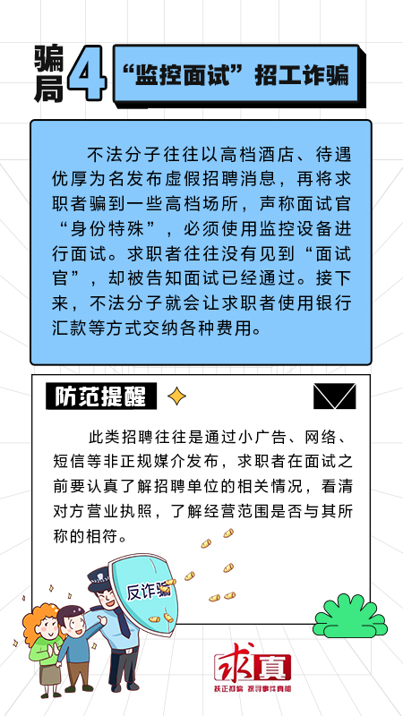 近期,正值毕业季,不少学生从校园走向社会。此时骗子们也蠢蠢欲动,打着“招工”“介绍工作”等名义实施诈骗。人民网“求真”栏目整理了几种常见的招聘骗局,提醒广大网友提高警惕,注意防范。