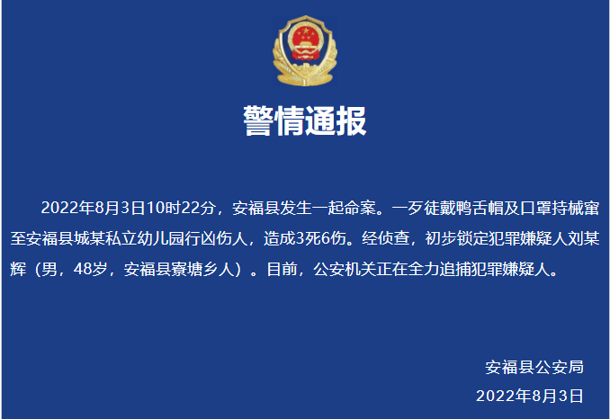 人民网北京8月3日电 (记者梁秋坪、郝萍)江西省吉安市安福县公安局3日发布警情通报称,2022年8月3日10时22分,安福县发生一起命案。一歹徒戴鸭舌帽及口罩持械窜至安福县城某私立幼儿园行凶伤人,造成3死6伤。经侦查,初步锁定犯罪嫌疑人刘某辉(男,48岁,安福县寮塘乡人)。目前,公安机关正在全力追捕犯罪嫌疑人。