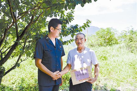 近日,重庆市九龙坡区人民法院开展涉老诈骗执行案款发放暨反诈宣传活动,执行法官通过上门和集中发放的方式将被骗案款送到老人们手中,并现场开展“防范养老诈骗”专题法治宣讲。正值高温天气,执行法官王蓓、王凯等与重庆市人大代表王晓娅、王光强一道,顶着烈日远赴南川某村,在走过数里崎岖山路后,将案款送到养老诈骗受害人退伍老兵王某手中。(记者 刘 洋 通讯员 范翼瑶 杨博皓 文/图)
