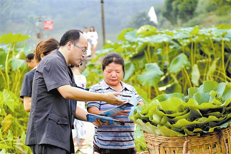 时值八月,正是莲藕成熟的季节,藕农们正在忙着挖藕、采叶。8月4日,翠屏区法院白花人民法庭干警一行深入永兴镇“万亩藕海”,通过发放宣传资料、一对一宣讲、面对面交流,向藕农们普及民法典等法律知识,解答他们在莲藕种植销售、家庭生活中遇到的法律问题,主动为他们出谋划策、排忧解难。图为干警现场普法。