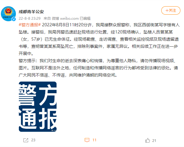 针对此事,四川省成都市公安局青羊区分局发布通告称:2022年8月8日11时20分许,我局接群众报警称,我区西御街某写字楼有人坠楼。接警后,我局民警迅速赶赴现场进行处置,经120现场确认,坠楼人员曾某某(女,57岁)已无生命体征。经现场勘查、走访调查、查看相关监控视频及现场遗留遗书等,查明曾某某系高坠死亡,排除刑事案件,家属无异议。相关后续工作正在进一步开展中。