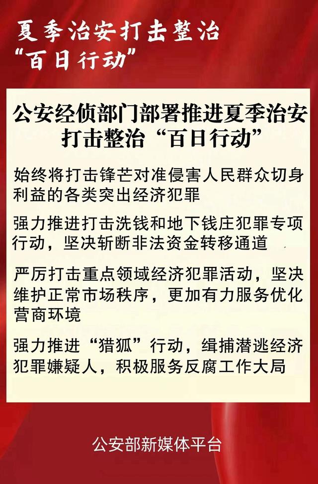 会议部署全国公安经侦部门深入贯彻公安部党委部署要求,提升政治站位,主动担当作为,发挥职能优势,纵深推进夏季治安打击整治“百日行动”,始终将打击锋芒对准侵害人民群众切身利益的各类突出经济犯罪,切实打出声威、打出实效,积极推动风险防范化解,以实际行动确保社会大局持续稳定,维护人民群众、企业合法权益。