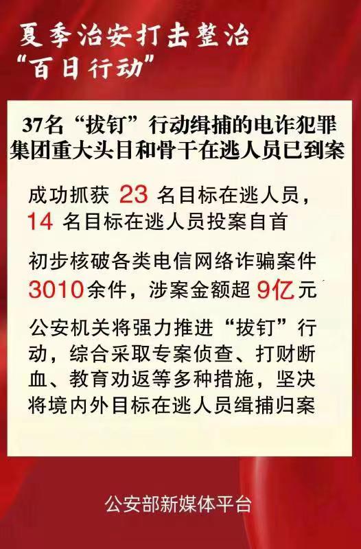 人民网北京8月18日电 (记者郝萍、梁秋坪)记者从公安部了解到,夏季治安打击整治“百日行动”开展以来,公安部部署全国公安机关深入推进“拔钉”行动,采取雷霆手段,发起凌厉攻势,依法严厉打击电信网络诈骗犯罪集团重大头目和骨干。截至目前,公安机关已成功抓获、劝投目标在逃人员37名,初步核破各类电信网络诈骗案件3010余起,涉案金额超9亿元,取得阶段性显著战果。