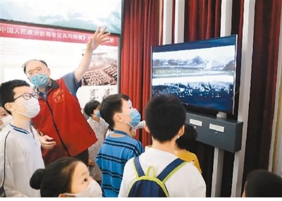 志愿者为孩子们讲述新中国首部宪法诞生的历史。 |