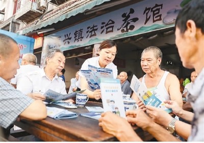 在四川省华蓥市永兴镇的“法治茶馆”,法治宣传员向群众发放普法资料并作解读。 |