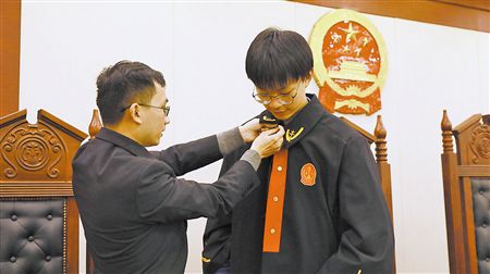 模拟法庭开庭前,法官帮“审判员”整理法袍。