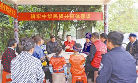 近日,广西壮族自治区钦州市钦北区人民法院大寺人民法庭到钦北区大寺镇南间村委那布村开展“六团八进”万场党课活动。该庭庭长李钦城与村民们围坐在一起,使用壮语、汉语两种语言宣讲党的二十大精神,通过讲解案例的方式向村民分享自己在司法实践中的所见所闻、所思所悟。图为法院干警向村民宣讲党的二十大精神。陈管文 摄