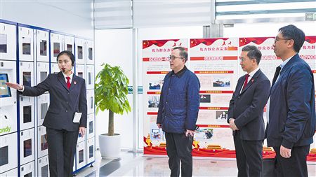图为全国人大代表张健(左二)体验诉讼服务大厅“云柜”服务。 何彦庆 摄