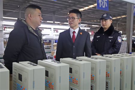 执行干警与当事人一起查看某公司生产线。张 权 摄