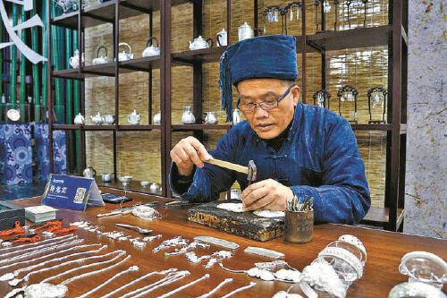 国家级非物质文化遗产项目苗族银饰锻制技艺代表性传承人杨光宾在制作银饰。