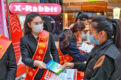 天津法院“巾帼普法志愿者”为群众解读妇女权益保障法内容。