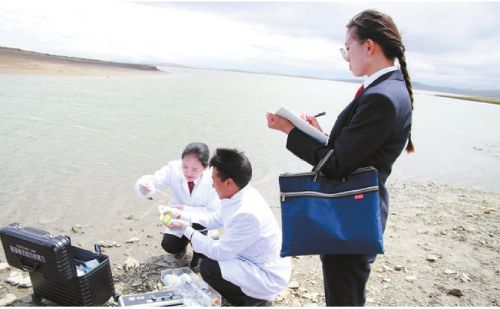 若尔盖县检察院检察人员对麦溪乡黄河沿线水质进行勘验检测。