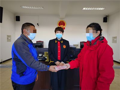 执行法官及法官助理为一起拖欠货款案件申请执行人发放执行款。