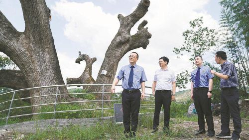 “这棵600多岁的古樟树被保护得怎么样?我们来听听大家的意见。”8月4日,浙江省台州市检察院党组书记、检察长王美鹏主持一起古木保护公益诉讼案件的公开听证会。临海市副市长、市自然资源和规划局负责人等参加听证会。台州市人大代表卢文飞,台州市政协委员郭燕飞,人民监督员陈灵光,“益心为公”志愿者卢俊、陈献志等受邀担任听证员。此前,涉案古树因保护不善出现枯萎迹象。2022年9月,检察机关收到举报后,依法向属地政府制发了检察建议,督促加强保护管理。经评议,听证员一致认为:在检察机关与当地政府的共同努力下,涉案古树的生存环境已经得到了科学、有力的保护。图为听证会前,王美鹏等人到临海市永丰镇现场察看古树保护情况。