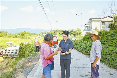 近日,重庆市垫江县人民法院干警立足“国家级水稻制种大县”,来到普顺镇水稻种植区,为种植户们讲解涉及农资购买、种子销售等环节的法律风险点。图为干警向种植户讲解涉种法律知识。高超 摄