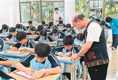 在乐东中学“法治剪纸”课堂上,剪纸课指导老师给孩子们做辅导讲解。 |