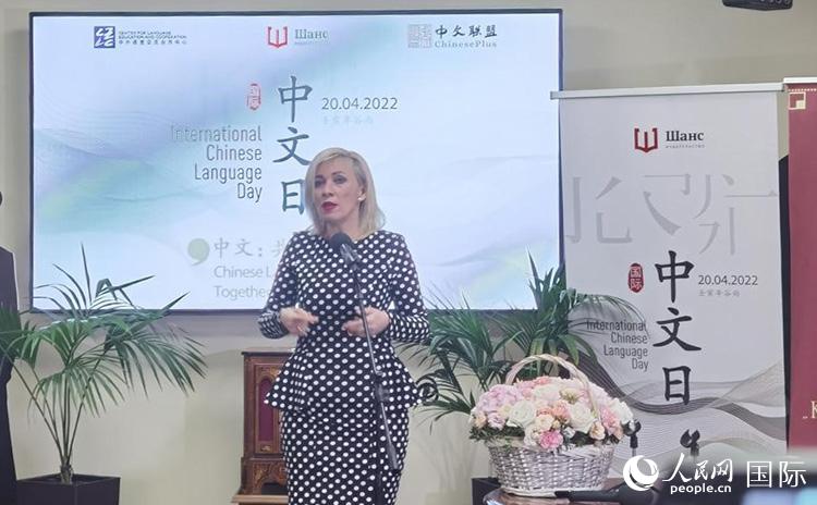 俄罗斯外交部信息与出版司司长扎哈洛娃致辞。人民网记者 荣翌摄