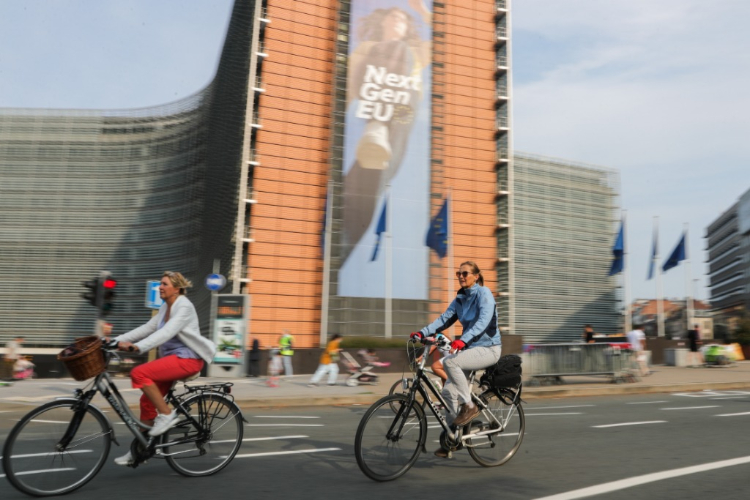 2021年9月19日,在比利时布鲁塞尔,人们骑车经过欧盟委员会总部大厦。新华社记者郑焕松摄