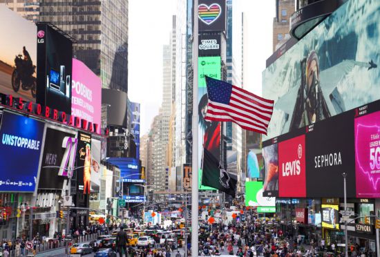 这是5月17日在美国纽约时报广场拍摄的美国国旗。新华社记者王迎摄