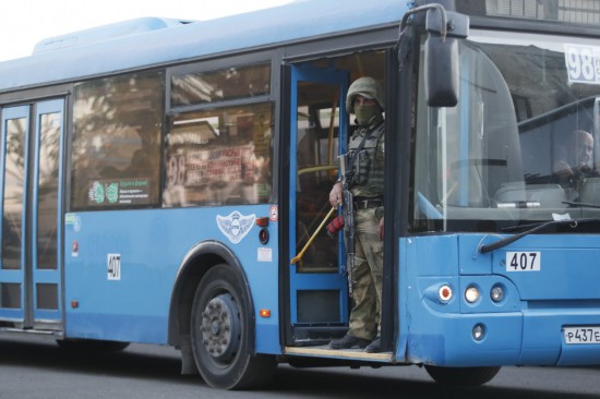 5月17日,在马里乌波尔,乌克兰武装人员在护送下乘坐巴士离开。俄罗斯国防部发言人科纳申科夫17日发布通报说,被围困在马里乌波尔亚速钢铁厂内的乌军和乌方军事力量“亚速营”人员已于16日开始投降。新华社发(维克托摄)