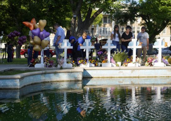 5月26日,在美国得克萨斯州南部尤瓦尔迪市,人们哀悼枪击事件遇害者。新华社记者吴晓凌摄