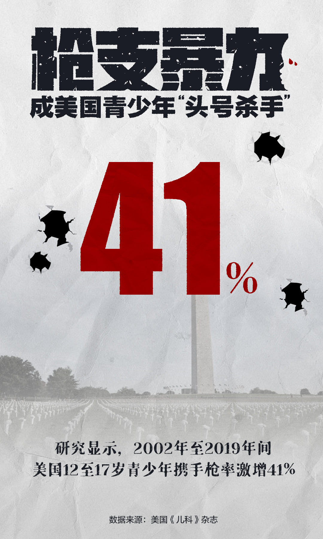 美国枪支泛滥,同时枪支文化根深蒂固,“以枪制枪、以暴制暴”等拥枪观点盛行,一些家长竟试图通过鼓励孩子持枪来保护他们免受枪击。美国《儿科》杂志2022年4月刊登的一项研究报告显示,2002年至2019年间,美国12至17岁青少年携枪率激增41%。