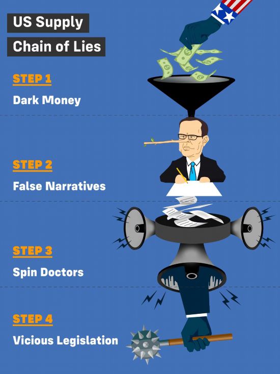 第一张图片展示了“美国涉华谎言产业链”——第一步,政府和企业提供“黑金”;第二步,智库学者炮制“黑论”;第三步,政客和媒体充当“黑嘴”;第四步,国会和政府出台“黑法”。↓