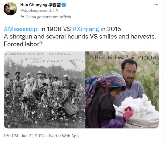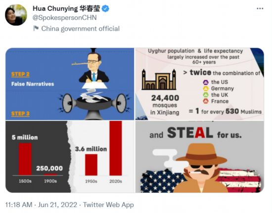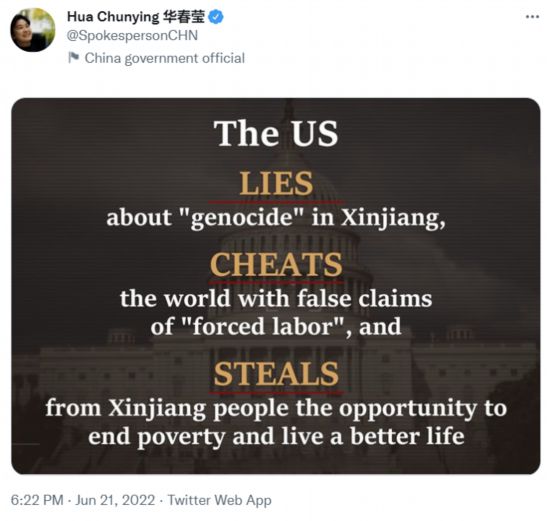 18时22分,华春莹在最新发布的一张图片中写道:“美国在所谓新疆‘种族灭绝’上撒谎,在所谓虚假宣称‘强迫劳动’上欺骗世界,以及偷窃新疆人民的脱贫致富的机会。”↓