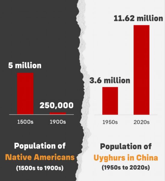 第三张图片对比了美国印第安人口数量的变化和中国新疆维吾尔族人口数量的变化。图片显示,从16世纪至20世纪,美国印第安人口数量从500万降至25万;而从1950年至2020年,中国新疆维吾尔族人口数量从360万增加至1162万。↓