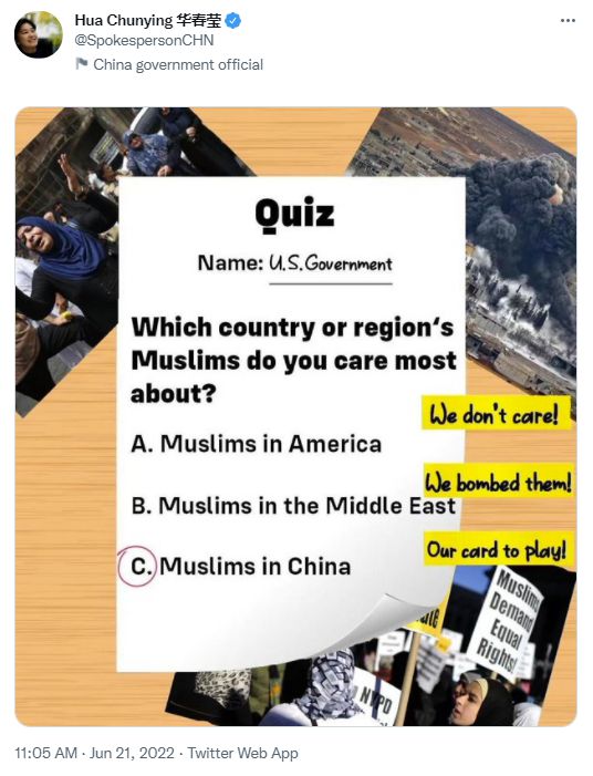 北京时间6月21日11时05分,华春莹先贴出一张图片,上面写道:小测验,名字:美国政府。测验的问题是:“你们(美国政府)最关心哪个国家或地区的穆斯林?”答案有三个选项:A选项是“在美国的穆斯林”,旁边配有一句话“我们(美国政府)不关心!”;B选项是“在中东的穆斯林”,旁边写着“我们轰炸他们!”而C选项是“在中国的穆斯林”,旁边写着“我们要打的牌”。图上画着圈圈的是C选项,显然意指美国政府“最关心”在中国的穆斯林,其“以疆制华”的政治图谋昭然若揭。↓