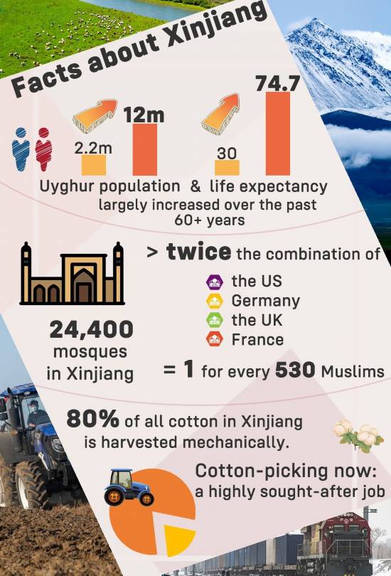 第二张图片展示了关于新疆的数个事实真相:过去60年里,新疆维吾尔族人口从220万增加至近1200万,人均预期寿命从30岁增长到72岁;新疆有2.44万个清真寺,相当于平均每530个穆斯林就拥有一座清真寺,新疆的清真寺数量是美、德、英、法四国总数的两倍多;新疆棉花机械采摘率高达80%,采棉工作岗位供不应求。↓