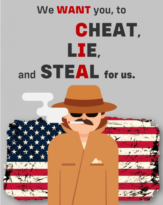 第四张图片,则是一张以美国国旗为背景的图片,图中叼着烟的男人说道:“我们想要你,为我们撒谎、欺骗、偷窃。”这句话出自美国前国务卿蓬佩奥2019年的言论:“我们撒谎、我们欺骗、我们偷窃。”↓