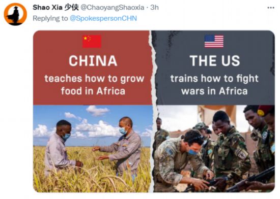 “中国在非洲教人们怎样种粮食 VS 美国在非洲教人们怎样打仗”
