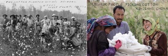 今天13时51分,华春莹发布第三组图片,图片是1908年的美国密西西比州和2015年的中国新疆,图片配文写道:“1908年密西西比 VS 2015年新疆:霰弹枪和几只猎犬 VS 微笑和收获。(哪个才是)强迫劳动?”↓