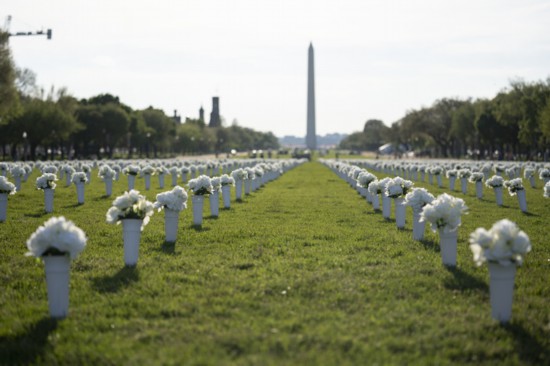 这是4月13日拍摄的美国华盛顿国家广场草坪上摆放的白色绢花。当日,四万朵白色绢花被摆放在国会大厦与华盛顿纪念碑之间的国家广场草坪上,以纪念在全美枪击事件中丧生的人们。新华社记者刘杰摄