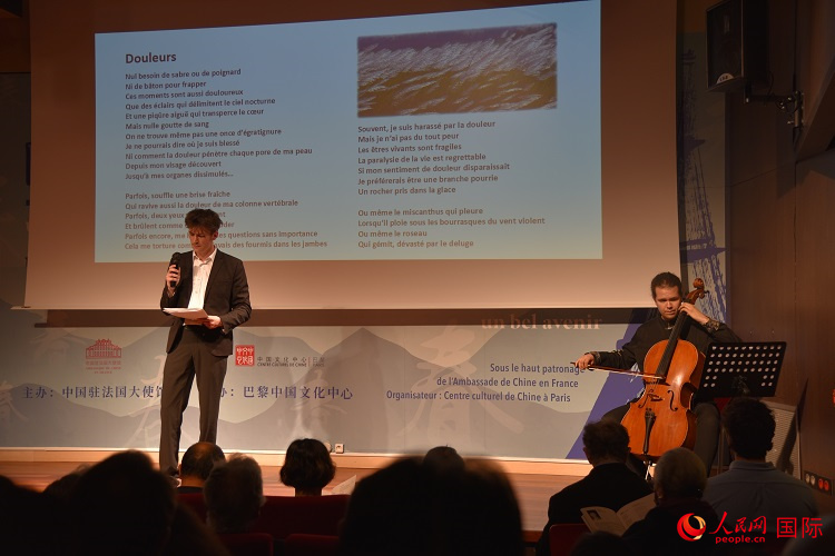 法国青年演员凡维登在悠扬的琴声中朗诵中文诗歌的法语翻译版。人民网记者 刘玲玲摄