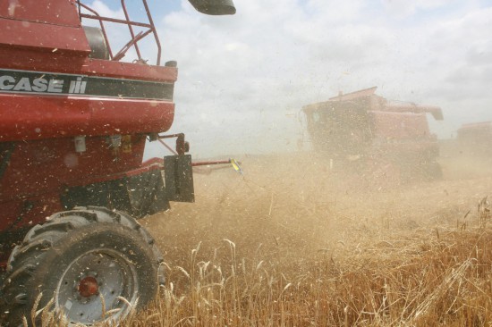 2008年7月17日,在乌克兰西南部的文尼察州,大型联合收割机在收割小麦。新华社记者宋宗利摄