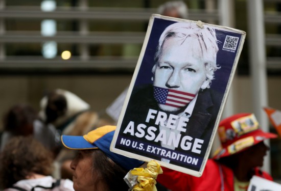 5月17日,民众在伦敦英国内政部大楼门前举行示威活动。由于担心英国内政部不久将批准向美国引渡“维基揭秘”网站创始人朱利安·阿桑奇,数百名英国民众17日在内政部大楼门前举行示威活动,呼吁阻止将阿桑奇引渡至美国。新华社记者李颖摄