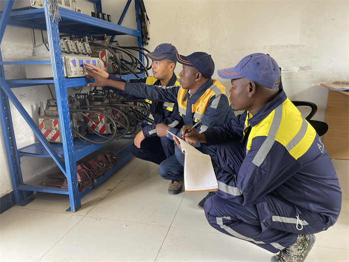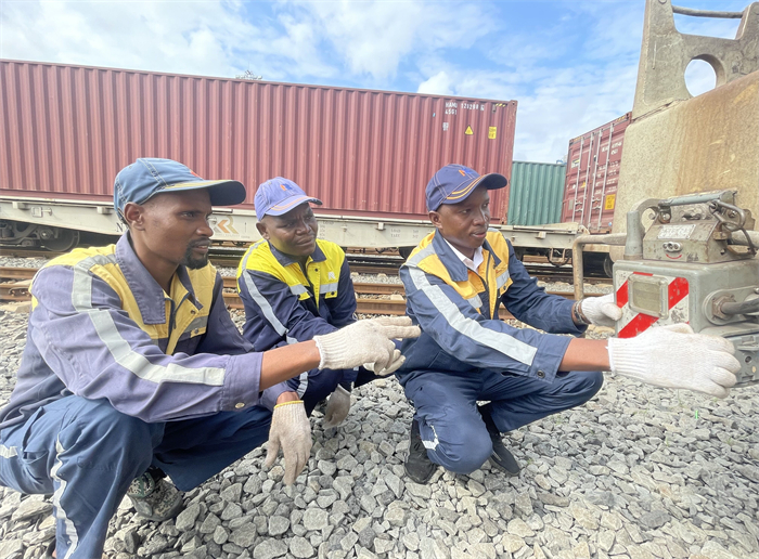 赫斯本·阿金加(中)和同事们检查列尾装置充电器工作情况。非洲之星铁路运营公司供图