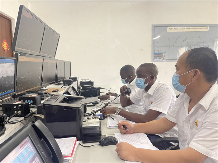在车站行车室内,赫斯本·阿金加(中)与工作人员共同确认调车信号开放状态。非洲之星铁路运营公司供图