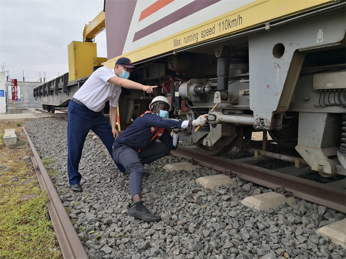 衡磊指导约翰·奥克奇检查机车走行部各部件是否良好。非洲之星铁路运营公司供图